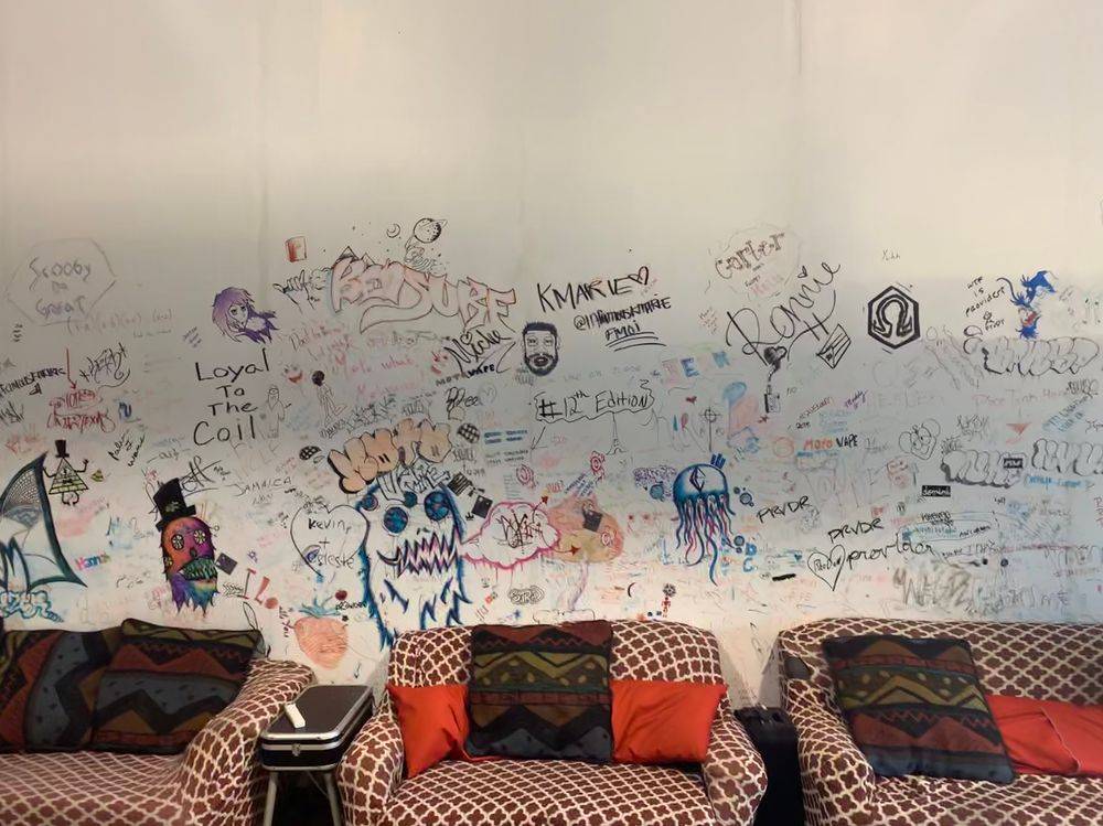 Vape shop with a graffiti wall come check it out